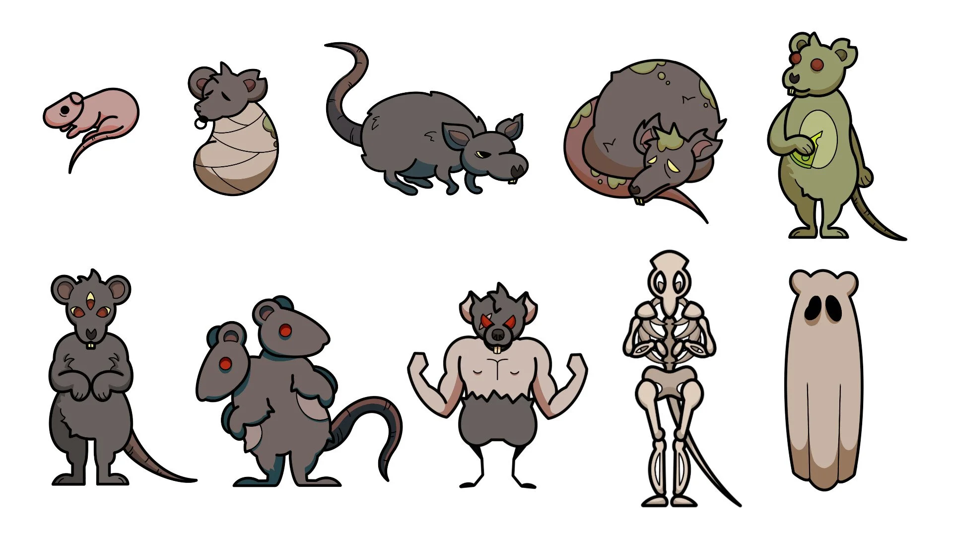 Ratiation is a merge game in which you merge rats with each other to evolve them, which means lots of different sprites were needed. As I was in charge of all the sprites, I had to sketch, line and colour 50 different rats in 2 different colourways.
